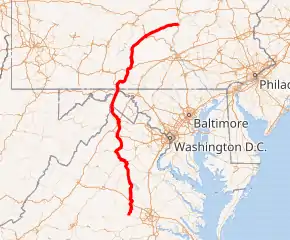 US 522 contains several segments that are part of the National Highway System. The U.S. highway is part of the main system from Virginia State Route 37 (SR 37) near Winchester to Interstate 70 (I-70) at Warfordsburg, Pennsylvania. US 522 is also part of the main system from the Pennsylvania Turnpike (I-76) at Fort Littleton to Pennsylvania Route 35 (PA 35) at Shade Gap and from the south end of its concurrency with US 22 at Mount Union to its northern terminus near Selinsgrove.[5][6][7][8] US 522 is a National Highway System principal arterial in four places in Virginia, including its concurrencies with SR 3 and US 15 Bus. in Culpeper, on its concurrency with US 211 between Sperryville and Massies Corner, from its southern junction with SR 55 to I-66 in Front Royal, and from the south end of its concurrency with US 11 in Winchester to SR 37 near Winchester.[5][9] The highway is also a principal arterial from PA 35 at Shade Gap to US 22 at Mount Union.[8] US 522's other junctions with highways part of the National Highway System along its 159.26-mile-long (256.30 km) course through Virginia include I-64 near Gum Spring; US 15 and US 29 in Culpeper; US 340 in Front Royal; and I-81, US 17, US 50, and SR 7 in Winchester. Other major junctions include one with West Virginia Route 9 (WV 9) in Berkeley Springs along its 18.74 miles (30.16 km) in West Virginia; I-68, I-70, and US 40 in Hancock during its 2.35-mile-long (3.78 km) streak across Maryland; and US 30 in McConnellsburg and US 22 and US 322 in Lewistown during its 128.237-mile-long (206.377 km) route through Pennsylvania.[5][6][7][8]