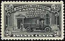 In 1885 Congress enacted the use of "a special stamp of the face valuation of ten cents ... [that] when attached to a letter, in addition to the lawful postage thereon ... shall be regarded as entitling such letter to immediate delivery."[1] The first Special delivery stamp was printed by the American Bank Note Company and issued on October 1, 1885. It could not be used to prepay postage or any other service. The stamp bears the words "Secures immediate delivery at a special delivery office,". In 1886 the Special Delivery service was expanded to all post offices and a new stamp was designed. The revised stamp was identical to the first issue of 1885 but instead bore the statement "Secures immediate delivery at any post office." The release of the revised stamp was delayed by the Post Office until 1888, however, allowing supplies of the first issue to be sold beforehand.[2] But the usage of such stamps had their drawbacks. Special Delivery only served communities whose population was over 4,000 people and could not guarantee delivery by a specific time. To be valid the Special Delivery stamp had to be affixed to the envelope along with all other postage and could not be used to prepay regular and airmail postage.[1]