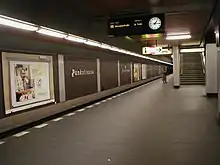 Beyond the Gesundbrunnen station, the line continues under Badstraße. At the junction with Pankstraße a station with the same name was constructed. The Pankstraße U-Bahn station was constructed to be usable as a shelter (e.g. in case of war). To this end Pankstraße has sanitary facilities, an emergency kitchen, a filtered ventilation system, et c. In an emergency it can shelter 3,339 people. The additional costs for these facilities were paid by the Federal Ministry of Finance. The walls are tiled in brown and the columns clad in aluminium sheeting. One curiosity remains at Pankstraße station: the silver letters affixed to the walls spell the name as "Pankstrasse", transliterating the eszett and ignoring the correct German spelling ("Pankstraße").