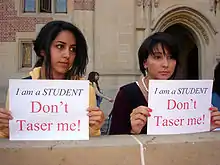At one point, the officers told the crowd to stand back and threatened to tase anyone who approached too closely.[11] A female student said that the officers threatened to tase her when she asked an officer for his name and badge number.[11] According to an ACLU attorney, such a threat of force in response to a badge number request constitutes illegal assault.[4] At 6:36 in the video, an officer tells a male student, "Get back over there or you're going to get tased, too."[4][6]