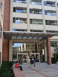UCLA's original residence hall was Hershey Hall, located on Hilgard Avenue in South Campus. It was named after Mira Hershey, who bequeathed $300,000 to have the all-women dorm built.[1] The original Hershey Hall of the 1930s is still in use today as an academic building. However, the west wing that was added later was demolished to make way for the Terasaki Life Sciences Building.[2] The men's wing, built in 1959, was located in the current site of Parking Garage 2.[3]