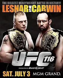 UFC 116: Lesnar vs. Carwin was a mixed martial arts event held by the Ultimate Fighting Championship on July 3, 2010 at the MGM Grand Garden Arena in Las Vegas, Nevada.[3] The show was voted as the Best Major Show in the 2010 Wrestling Observer Newsletter Awards, the first time a UFC show won the award. This is the eighth-best selling pay-per-view in UFC history.