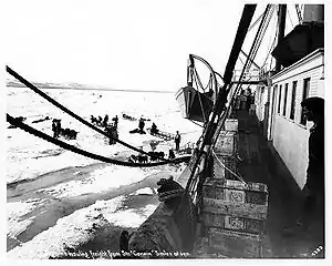 Finding the streams near Cape Chaplino still ice-clogged, the Corwin returned to Nome. In mid-July she headed north on a minerals exploration trip. She reached the coal deposits after prospecting stops at Grantley Harbor (adjacent to Port Clarence, Alaska) and along the coast. The largest seam had already been staked by a competing company (that party traveled by land), but the Corwin's party staked several other claims, mined and loaded coal, and returned to Nome with 100 tons (four lighter-loads) to sell. Coal was handled in sacks of 200 lb, lowered down the cliffs by rope. It reportedly sold tor $18–20 per ton at Nome.[48] A second trip developed the mines and brought out 25 tons.[3][49]
