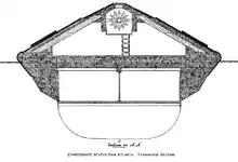 The rectangular casemate was pierced with eight narrow gun ports, one each at the bow and stern and three along each side. Each gun port was protected by an armored shutter made of two layers of iron riveted together and allowed the guns to elevate only to a maximum of +5 to +7°. Atlanta was armed with single-banded, 7-inch (178 mm) Brooke rifles on pivot mounts at the bow and stern.[12] The middle gun port on each side was occupied by a single-banded, 6.4-inch (163 mm) Brooke rifle. The 17-caliber, seven-inch guns weighed about 15,000 pounds (6,800 kg) and fired 80-pound (36 kg) armor-piercing "bolts" and 110-pound (50 kg) explosive shells. The equivalent statistics for the 18.5-caliber, 6.4-inch gun were 9,110 pounds (4,130 kg) with 80-pound bolts and 64-pound (29 kg) shells.[13] Atlanta was also armed with a 20-foot (6.1 m), solid iron, ram that was reinforced by a series of vertical steel bars. In front of the ram was a spar torpedo that carried 50 pounds (23 kg) of black powder on a wooden pole connected to an iron lever that could be raised or lowered by means of pulleys.[14]