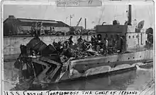 Cassin, her rudder blown off and stern extensively damaged, began to circle. This did not prevent her, however, from firing four rounds at the submarine when she spotted its conning tower at 1430. The submarine, thus discouraged from further attack, submerged and was not contacted again. Through the night, Cassin was guarded by the American destroyer Porter and the British sloop HMS Jessamine and HMS Tamarisk,[14] a disguised sloop under Captain Ronald Niel Stuart. In the morning, HMS Snowdrop took Cassin in tow for Queenstown. After repairs there and at Newport, England, Cassin returned to escort duty on 2 July 1918.[7]