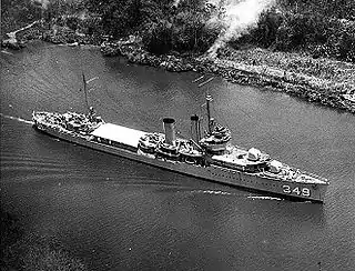 The first USS Dewey (DD-349) was a Farragut-class destroyer of the United States Navy, launched in 1934 and named for Admiral George Dewey. Dewey served in the Pacific through World War II. After escaping damage during the attack on Pearl Harbor, Dewey screened the aircraft carrier USS Lexington until the carrier was lost in the battle of the Coral Sea; then screened USS Saratoga through the invasion of Guadalcanal and the battle of the Eastern Solomons. Following overhaul in San Francisco, Dewey spent 1943 in Alaskan waters supporting the invasions of Attu and Kiska. Dewey spent 1944 supporting raids in the Marshalls, Carolines, and Marianas, including screening carriers during the battle of the Philippine Sea. After being damaged by Typhoon Cobra during the recapture of the Philippines, Dewey supported the invasion of Iwo Jima and spent the remainder of the war screening replenishment oilers.