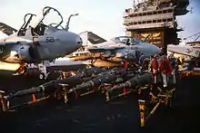 In October 1983 John F. Kennedy was diverted to Beirut, Lebanon from her planned Indian Ocean deployment, after the Beirut barracks bombing killed 241 US military personnel taking part in the Multinational Force in Lebanon, and spent the rest of that year and early 1984 patrolling the region. On 4 December 1983 ten A-6 aircraft from John F. Kennedy along with A-6 and A-7 aircraft from USS Independence took part in a bombing raid over Beirut, in response to two US F-14 aircraft being fired upon the previous day. The Navy lost two aircraft during the raid: an A-7E from Independence and an A-6E from John F. Kennedy were shot down by SAMs. The A-7E pilot was picked up by a fishing boat, but the A-6E pilot Lt. Mark Lange died after ejecting and the B/N Lt. Robert "Bobby" Goodman was taken prisoner and released on 3 January 1984.[2]
