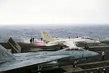 In July 2004 John F. Kennedy collided with a dhow in the Persian Gulf, leaving no survivors on the traditional Arab sailing boat.[17] After the incident the Navy relieved the commanding officer of John F. Kennedy. The carrier itself was unscathed, but two jet fighters on the deck were damaged when an F-14B Tomcat assigned to VF-103 slid into an F/A-18C Hornet assigned to VFA-81 damaging the wing of the F-14 as well as the upper section of the radome and forward windscreen of the F/A-18 as the ship made a hard turn to avoid the tiny vessel. A popular misconception is that John F. Kennedy's captain waited to make the turn at the last possible moment to recover aircraft critically low on fuel returning from airstrikes. The official review board determined this was not the case and the aircraft could have remained safely aloft until John F. Kennedy maneuvered to avoid the dhow.[18]
