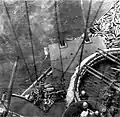 Nevada became a prime target for Japanese Val dive bombers during the second wave. Japanese pilots intended to sink her in the channel, ostensibly to block the harbor.[64] Tactically target selection was wrong as 14–18 dive bombers attacking her wouldn't be able to sink a battleship with 250 kg bombs[65] and the channel's width of 1200 feet made bottling up the harbor impossible.[66] As she steamed past Ten-Ten Dock[lower-alpha 12] at about 09:50, Nevada was struck by five bombs. One exploded over the crew's galley at Frame 80. Another struck the port director platform and exploded at the base of the stack on the upper deck. Yet another hit near No. 1 turret inboard from the port waterway and blew large holes in the upper and main decks. Two struck the forecastle near Frame 15; one passed out through the side of the second deck before exploding, but the other exploded within the ship near the gasoline tank; leakage and vapors from this tank caused intense fires around the ship.[62]