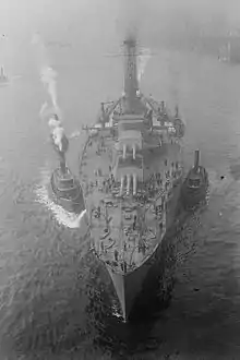On 13 December, 10 battleships, including Nevada,[lower-alpha 10] and 28 destroyers escorted the ocean liner George Washington, with president Woodrow Wilson embarked, into Brest, France, during the last day of Wilson's journey to the country so he could attend the Paris Peace Conference. The flotilla met George Washington and her escorts (Pennsylvania and four destroyers) just off Brest and escorted them into the port.[49] The 10 battleships sailed for home at 14:00 on the next day, 14 December.[50] They took less than two weeks to cross the Atlantic, and arrived in New York on 26 December to parades and celebrations.[44]