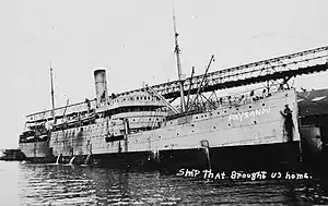 The regimental historian notes of the voyage aboard Paysandu that the ship "was not in very good condition, as she had been laid up for years in South America and it was impossible to get any speed out of her. She was only 375 feet long and had no cargo in her and pitched and rolled constantly, causing a great deal of seasickness."[12] Nonetheless, the troops were in good spirits as they were homeward bound. Paysandu had better food and accommodations than the troops had enjoyed on their outbound journey to France aboard USS Leviathan, and the troops were permitted on deck more frequently. To help pass the time on Paysandu, the Regimental "theatrical talent" organized shows and concerts, while "moving picture outfits" and boxing and wrestling matches provided further entertainment.[13] The Regimental barbers were also kept busy, as many of the troops were keen to look their best on their arrival home.[14]