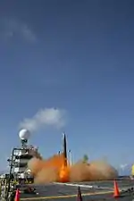 Tripoli was decommissioned in 1995 and as of 2004, she was on loan to the US Army, but remained laid up at Mare Island Naval Shipyard. In December 2006, the ship was towed to Pearl Harbor, Hawaii, where it had a high-tech role as a launch platform with the United States' developing ballistic missile defense program. Three times the ship was towed some 100 miles (160 km) off shore and used to launch small ballistic missiles, which were then intercepted by Terminal High Altitude Area Defense Missiles, test-fired from the Pacific Missile Range Facility. The last test in the series was performed 26 October, when the ship fired a "Scud-like" missile, which was successfully intercepted. The ship was towed back to the San Francisco Bay Area for the winter. As the Hawaiian island of Kaua'i lacked a suitable land-based launch site, and the costs of building one would far exceed the approximately $600,000 per year it costs to use the old warship, so the vessel returned to Pearl Harbor for a second series of tests in late spring 2008.[4] In March 2015, the ship was towed back through the Panama Canal and stored with the Beaumont Reserve Fleet.[5] In August 2016 the US Maritime Administration designated it for disposal.[6] In July 2018, Tripoli was towed from Beaumont to Brownsville, Texas, for scrapping by European Metal Recycling.[7]