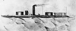 Winnebago and her sister Milwaukee sailed upriver on 28 March to attack a Confederate transport and forced it to retreat, but Milwaukee struck a mine, in an area previously swept, as they were returning downriver. She remained afloat forward, which permitted her crew to escape without loss.[13] Winnebago later protected a convoy carrying some 13,000 troops under Major General Frederick Steele, to Selma and Montgomery, Alabama later in April.[6] By 28 April, the monitor, together with the gunboats USS Octorara and Sebago, was blockading the Confederate ironclad Nashville and the gunboat Morgan up the Tombigbee River,[14] until their surrender.[6]