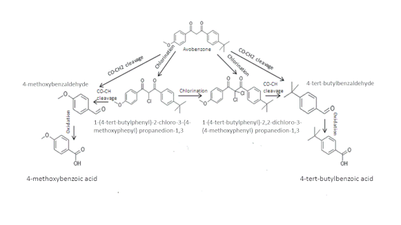 4-tert-Butyl-4’-methoxydibenzoylmethane, known as avobenzone, belongs to dibenzoylmethanes. It is one of the most common UVA (400-320 nm) filters used in sunscreens formulations. It is sold under the trade names Parsol 1789 or Eusolex 9020. Avobenzone exists in two tautomeric forms: enol and keto. In sunscreen formulations, avobenzone exists predominantly in the enol form, which has a maximum absorption at wavelengths ranging from 350 to 365 nm depending on the solvent used. The double bond of the enolic form was shown to be more reactive in conditions of aquatic chlorination than the aromatic ring. In a chlorinated aquatic environment, Avobenzone transforms to two corresponding aldehydes and acids, as shown in the figure. Both aldehydes are formed as a result of the CO-CH2 bond. They are less stable in the oxidative conditions and easily transform into the corresponding acids.