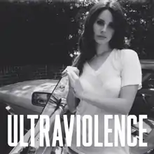 On May 8, Del Rey announced the track listings for the 11-track standard version and 14-track deluxe version of Ultraviolence.[34] Its black-and-white album artwork depicts Del Rey dressed in a sheer white T-shirt and a white strapless bra while leaning against her Mercedes-Benz 380SL; the title "Ultraviolence" is positioned beneath her image in an all-capitalized typeface, similar to the covers for Born to Die and Paradise.[35] The artwork was unveiled on May 14, along with the confirmation that the record itself would be released on June 17 in the United States.[36] It was made available through the traditional CD, digital download, and vinyl formats, and was additionally distributed in a multi-piece box set; it covers the title "Ultraviolence" in black foil, includes the deluxe record on compact disc and on a two-piece vinyl collection, and is packaged with four photo art cards.[37] Clothing retailer Urban Outfitters offers an exclusive vinyl version of the standard version of Ultraviolence, and features an alternate cover which depicts a close-up of Del Rey's knee in torn jeans as she holds a loose strand of fabric from the torn denim.[38]
