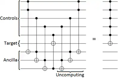Uncomputation is a technique, used in reversible circuits, for cleaning up temporary effects on ancilla bits so they can be re-used.[1]