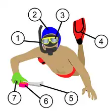 1. snorkel and mouth guard 2. hat with ear guards 3. mask 4. fins 5. stick 6. puck 7. glove