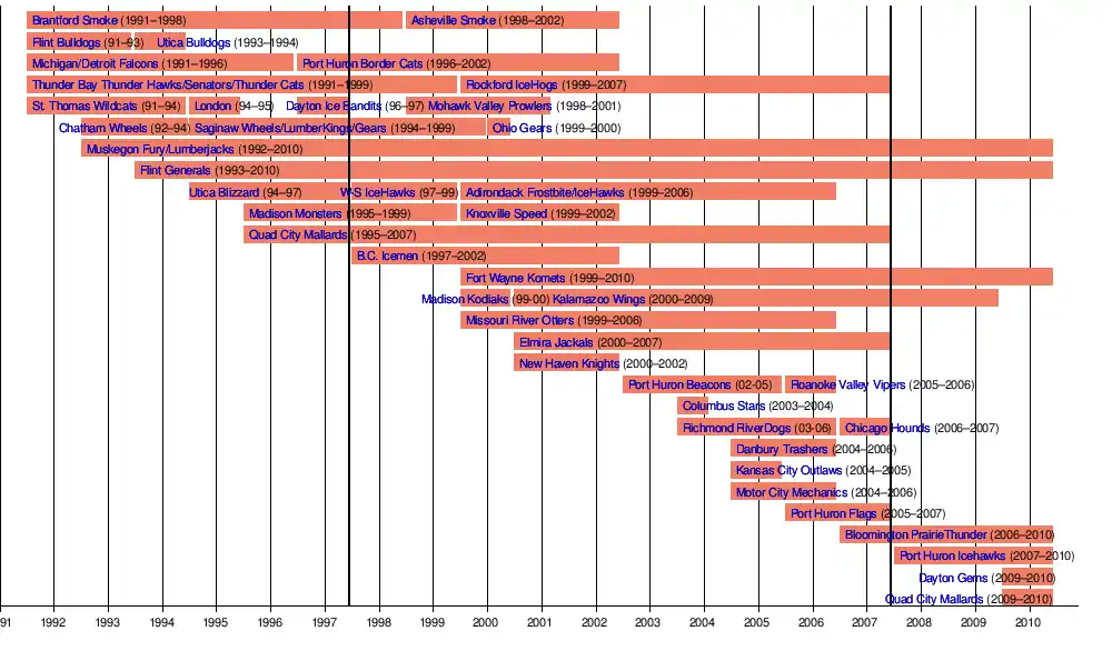 Port Huron Icehawks (Folded June 10, 2010) Flint Generals (Folded June 10, 2010)[8] Franchises merged into CHL: Bloomington PrairieThunder Dayton Gems Evansville IceMen Fort Wayne Komets Quad City Mallards |