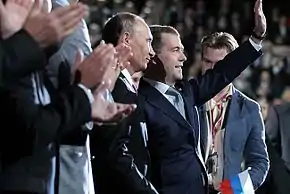 Contrary to its creators' expectations, Unity's election campaign was a huge success and the party received 23.3% of the votes, considerably more than OVR's 13.3% and within one percentage point of the Communist Party's 24.3%.[26][27] The popularity of the prime minister proved decisive for Unity's victory.[27] The election results also made clear that Putin was going to win the 2000 presidential election, which resulted in competitors Luzhkov and Yevgeni Primakov dropping out. Yeltsin also gave Putin a boost by resigning as President on 31 December 1999.[26]