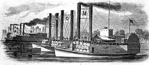 In March 1862, Secretary of War Edwin M. Stanton appointed Ellet colonel of engineers and authorized him to form the United States Ram Fleet on the Mississippi River. The Union Navy's Mississippi River Squadron and the Confederate River Defense Fleet were battling for control of the Mississippi and Stanton was convinced by Ellet that the Union Navy efforts would benefit from the addition of ram ships.[3] Ellet and the ram fleet were outside of Union Army or Navy command and reported directly to Stanton.[4]