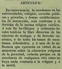 The power that the Catholic Church and the Aycinena family - to whom most of Carrera's advisors and secretaries belonged - had during the conservative regime in Guatemala was ratified the Concordat of 1854, in which Guatemala entrusted the education of its people to the regular clergy of the Catholic Church, committed itself to respect all church property -including haciendas, monasteries and sugar mills, authorized mandatory tithing and let the bishops censor all the country's publications; in return, Guatemala obtained indulgences for Army members, was allowed to keep all those properties that had been taken from the orders in 1829 - provided they were now in private hands, received a tax of the church inconme and had the right to prosecute any priest or bishop under Guatemalan law, if necessary.[11] The concordat was designed by Juan José de Aycinena y Piñol, who was a cabinet member of the government - besides being the University president; then, it was first ratified by Secretary of the Interior, Justice and Ecclesiastical affairs Pedro de Aycinena and finally, approved by president Rafael Carrera, who in 1854 was appointed as Guatemala's president for life.
