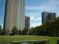 Over the course of 1968 to 1970 and with the assistance of the local redevelopment authorities, Penn acquired, cleared and redeveloped the four-block area between 38th, 40th, Spruce, and Walnut streets. The primary features of this area, which became known as "Superblock", are three high-rise apartment-style dormitories.[28] The key purpose of creating these high-rises was to accommodate 3,500 more students at the university. The whole superblock project and especially the high-rise design were widely criticized,[29] but this view is not held by everyone.[30]