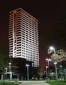 In 1963, construction began on the University's new Chicago campus at Harrison and Halsted Streets at the ground of the former Greektown, Chicago. In February 1965, the new Chicago campus opened and was named the University of Illinois at Congress Circle (UICC) referencing the nearby Circle Interchange of I-290 and I-90/I-94).[22] Shortly before opening, the Congress Expressway was renamed the Eisenhower Expressway and the campus was renamed to University of Illinois at Chicago Circle (UICC). UICC was designed in the brutalist style by Walter Netsch of Skidmore, Owings and Merrill, a Chicago-based architectural firm responsible for many of today's tallest skyscrapers.[23][24][25] Unlike the CUD campus, Circle was a degree-granting institution. Within five years of the campus' opening, in addition to undergraduate degrees, virtually every department offered graduate degrees.