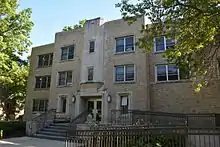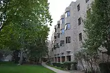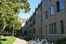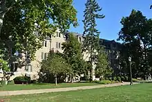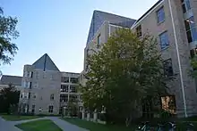 There are currently 33 undergraduate residence halls at the University of Notre Dame, including 32 active residence halls and Pangborn Hall, which serves as a transition dorm when residence halls undergo construction. Several of the halls are historic buildings which are listed on the National Register of Historic Places.[1] Each residence hall is single-sex, with 17 all-male residence halls and 14 all-female residence halls.[2] Notre Dame residence halls feature a mixed residential college and house system, where residence halls are the center of the student life and some academic teaching; most students stay at the same hall for most of their undergraduate studies.[3][4] Each hall has its own traditions, events, mascot, sports teams, shield, motto, and dorm pride.[5][6][7] The university also hosts Old College, an undergraduate residence for students preparing for the priesthood.