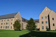 With the exception of Carroll Hall, the residence halls are split among six main segments of the campus: Main (God) Quad, South Quad, North Quad, Mod Quad, West Quad, and East Quad. (Carroll has its own lawn, by Saint Mary's Lake, informally called "Far Quad.") All first-year students are not only guaranteed on-campus housing, but are required to reside on campus for at least six semesters, starting with the Class of 2022.[7] Many of the halls were inserted in 1973 on the National Register of Historic Places.[16][17]