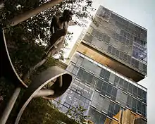 Developed after the Second World War, the western section of the campus consists mainly of modernist and internationalist structures that house laboratories and faculty offices.[37] The most significant example of Brutalist architecture is the massive Robarts Library complex, built in 1972 and opened a year later in 1973. It features raised podia, extensive use of triangular geometric designs and a towering fourteen-storey concrete structure that cantilevers above a field of open space and mature trees.[50] Sidney Smith Hall is the home to the Faculty of Arts and Science, as well as a few departments within the faculty. The Leslie L. Dan Pharmacy Building, completed in 2006, exhibits the high-tech architectural style of glass and steel by British architect Norman Foster.[51]