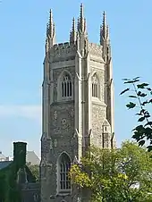 A lawn at the northeast is anchored by Hart House, a Gothic-revival student centre complex. Among its many common rooms, the building's Great Hall is noted for large stained-glass windows and a long quotation from John Milton's Areopagitica inscribed around the walls.[43][44] The adjacent Soldiers' Tower stands 143 feet (44 m) tall as the most prominent structure in the vicinity, its stone arches etched with the names of university members lost to the battlefields of the two World Wars.[45] The tower houses a 51-bell carillon played on special occasions such as Remembrance Day and convocation.[46] North of University College, the main building of Trinity College displays Jacobethan Tudor architecture, while its chapel was built in the Perpendicular Gothic style of Giles Gilbert Scott.[47] The chapel features exterior walls of sandstone and interiors of Indiana Limestone and was built by Italian stonemasons using ancient building methods.[48] Philosopher's Walk is a scenic footpath that follows a meandering, wooded ravine, the buried Taddle Creek, linking with Trinity College, Varsity Arena and the Faculty of Law. Victoria College is on the eastern side of Queen's Park, centred on a Romanesque main building made of contrasting red sandstone and grey limestone.[49]