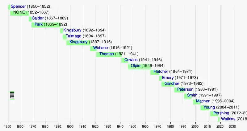 ![]() | David O. Calder | 1867-1869[3] | David O. Calder was a Mormon Pioneer from Scotland who was assigned by Brigham Young to re-open the University after its fifteen-year closure. |