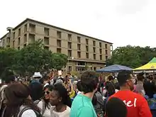 The 1970s saw the construction of Jubilee Hall and the Wartenweiler Library, as well as the opening of the Tandem Accelerator; the first, and to date only, nuclear facility at a South African university.[15] In 1976, Lawson's Corner in Braamfontein was acquired and renamed University Corner. Senate House, the university's main administrative building, was completed in 1977. The university underwent a significant expansion programme in the 1980s. The Medical School was moved to new premises on York Street in Parktown on 30 August 1982. Additionally, in 1984 the University acquired the Milner Park showgrounds from the Witwatersrand Agricultural Society. These became West Campus,[18] with the original campus becoming East Campus.[1] In 1984, the Chamber of Mines building opened. A large walkway named the Amic Deck was constructed across the De Villiers Graaff Motorway which bisects the campus, linking East Campus with West Campus.[1]