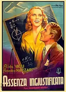 Unjustified Absence (Italian: Assenza ingiustificata) is a 1939 Italian comedy film directed by Max Neufeld and starring Alida Valli, Amedeo Nazzari and Lilia Silvi. A girl leaves school to marry a doctor, but becomes annoyed by his constant absences and decides to secretly resume her studies.[1]