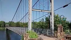 Upper Bridge, also known as the Warsaw Swinging Bridge, is a historic cable suspension bridge located at Warsaw, Benton County, Missouri. It originally opened in 1904 and rebuilt in 1928 after a tornado in 1924. It measures 600 feet (180 m) long, and spans the Osage River. It has a 500-foot (150 m) span between steel towers.[2]:5