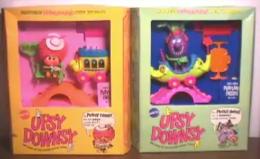 Upsy Downsy is a brand developed by Mattel. It concerns two races of strange beings, one that lives rightside-up (The Upsys), the other upside-down (The Downsys).[1] These psychedelic creatures and their fantasy world were featured in a short-lived line of colorful toys and story books for young children in 1970 (copyright in 1969).