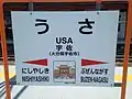 The station name board makes a visual pun about the station name and the United States. There is also a graphic of the Usa shrine.