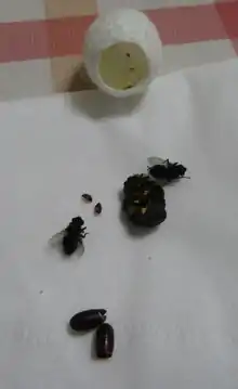 Uzi flies are parasitic on lepidoptera larvae and can therefore be beneficial but are a problem for silkworm rearers. The life span of adult males is about 5–15 days, adult females is about 20–25 days and alternate hosts can live 55 days. Its flight range is about 4 km. It gets attracted to rearing room due to kairomones, and it can locate host in 30 seconds. Uzi flies lay their eggs on the silkworm caterpillar mainly in the intersegmental region. Caterpillars in the fourth and fifth instar are preferred. Its egg period is 2–3 days. Its larval period is 8 days, and pupal period is about 10–14 days.