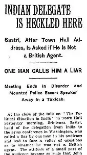 - "INDIAN DELEGATE IS HECKLED HERE; Sastri, After Town Hall Address, Is Asked if He Is Nota British Agent.ONE MAN CALLS HIM A LIAR Meeting Ends in Disorder and Mounted Police Escort SpeakerAway In a Taxicab" (PDF). The New York Times. 29 January 1922.