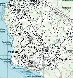 The original name of the village was Tuāulu.[2] In 1926, Tuāulu and another village within the district, named Vailoa, combined to form the Vailoa-tai village.[3] Although the whole of the village is named Vailoatai, residents further divide it into Vailoa-uta and Falīlī areas. [ tai - on the side towards the sea, seaside; uta - on the side towards the land, inland ]