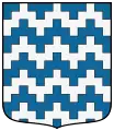 There are also forms of vair in which the arrangement of the rows is changed. The most familiar is counter-vair (Fr. contre vair), in which succeeding rows are reversed instead of staggered, so that the bases of the panes of each tincture are opposite those of the same tincture in adjoining rows. Less common is vair in pale (Fr. vair en pal or vair appointé, Ger. Pfahlfeh), in which the panes of each tincture are arranged in vertical columns. In German heraldry one finds Stürzpfahlfeh, or reversed vair in pale. Vair in bend (Fr. vair en bande) and vair in bend sinister (Fr. vair en barre), in which the panes are arranged in diagonal rows, is found in continental heraldry. Vair in point (Fr. vair en pointe, Ger. Wogenfeh, "wave vair") is formed by reversing alternate rows, as in counter-vair, and then displacing them by half the width of a pane, forming an undulating pattern across adjoining rows. German heraldry also uses a form called Wechselfeh, or "alternate vair", in which each pane is divided in half along a vertical line, one side being argent and the other azure.[3][4] Any of these may be combined with size or color variations, though the variants which changed several aspects are correspondingly rarer.