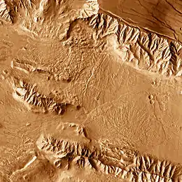 Further to the east from Oudemans, Ius and Tithonium chasmata are located parallel to each other, Ius to the south and Tithonium to the north. Ius is the wider of the two, leading to Melas Chasma. Ius has a ridge down the center of it by the name of Geryon Montes, composed of the undivided basement rock. The floor of Ius Chasma is mostly composed of pristine landslide material, not much degraded by cratering or erosion. The southern wall of Ius, and to a lesser extent the northern wall, has many short valleys stretching off roughly perpendicular to the line of the chasmas. These valleys have a stubby theater-headed leading edge very much like features seen on the Colorado Plateau near the Grand Canyon that appear from groundwater sapping. (Theater-headed means that, from above, the head of the valley is a well-defined U-shape). The valley is propagated by the continued erosion and the collapse of the wall.[13] Tithonium Chasma is very similar to Ius, except it is lacking the sapping features on the south side and contains a small portion of material that is similar to the smooth floor features except that it appears to be an ash fall that has been eroded by the wind. Between the two canyons, the surface is composed of younger fractured material - lava flows and faults from crustal extension of the Tharsis Bulge.[11]