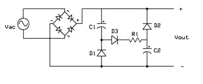When the AC voltage is applied, the rectified line voltage is applied across C1 and C2, as they are both charged via D3 and R1, until C1 and C2 are each charged up to approximately half of the peak line voltage. When the line voltage falls below the peak, into the "valley" phase, Vout begins to fall toward half of the peak line voltage. At this point, C1 and C2 begin to discharge into the load at Vout, via D1 and D2 respectively. R1 is needed to prevent a large in-rush current, and electromagnetic interference (EMI).[1]