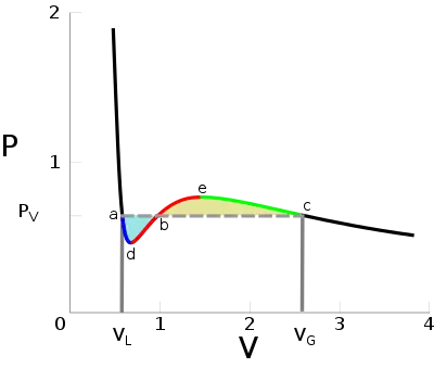 where pV is the vapor pressure (flat portion of the curve), VL is the volume of the pure liquid phase at point a on the diagram, and VG is the volume of the pure gas phase at point c on the diagram. A two-phase mixture at pV will occupy a total volume between VL and VG, as determined by Maxwell's lever rule.