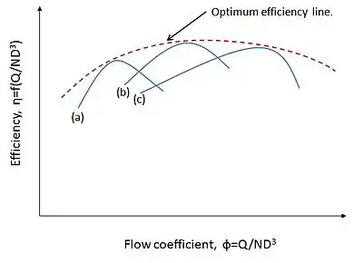 If all fluid velocities at corresponding points within the turbomachine are in the same direction and proportional to the blade speed, then the operating condition of a turbomachine at two different rotational speeds will be dynamically similar. If two points, each on dissimilar head-flow characteristics curve, represent similar dynamic operation of the turbo machine, then the non-dimensional variables (ignoring Reynolds number effects) will have same values.