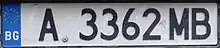 Standard Bulgarian vehicle registration plates display black glyphs (alphanumeric characters) on a white background, together with – on the left-hand side of the plate – a blue vertical "EU strip" showing the flag of Europe (or, for older-registered cars, the flag of Bulgaria) and, below it, the country code for Bulgaria: BG.