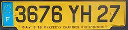 Vehicle registration plates are mandatory number plates used to display the registration mark of a vehicle registered in France. They have existed in the country since 1901. It is compulsory for most motor vehicles used on public roads to display them.