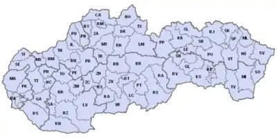 There are 79 districts in Slovakia. In 69 cases, the district is named after and the code derived from its principal city which is included in the district. Two cities, Bratislava (the capital) and Košice (KE), consist of 5 and 4 districts respectively. This fact is not reflected on the plates, only one code is used. Additionally, Košice-okolie (KS) comprises an area around Košice (the city itself excluded) while having its seat in the city proper. Each district is assigned at least one code. Ten cities including eight seats of the region (kraj) are assigned more. Since 18 August 2010, Bratislava has been registering plates with its second code, BL.[2] The Ministry of Interior of the Slovak Republic held a Facebook poll as the reaction to public dissatisfaction of Bratislava inhabitants with the previously intended BD code. As the combinations of the BL code are to be exhausted soon, another Facebook poll was organised in November 2018. Participants were asked to vote for the next code in three rounds (two semi-finals and one final). As much as 89% opted for the BT code over the BE.[3] Bratislava is the only okres to do so and will remain in this position for years as Košice, the runner-up, has only reached the ML series as of August 2019.
