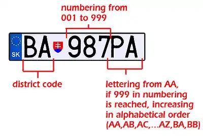 - Regular plates are the most commonly used of all the types. They contain seven characters starting with the district code (see below) followed by a series of 3 numbers and 2 letters. The number series used are between 001 and 999. The letter series are between AA-XZ and ZA-ZZ. 24 letters are used (excluding Q, W and Slovak letters such as Š). Progression: 001AA-002AA...999AA, then 001AB-999AB. 999AZ is followed by 001BA through 999BB etc. Only Bratislava has reached 999ZZ as of February 2011.