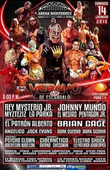 First held during the summer of 1997 the Mexican professional wrestling, company Lucha Libre AAA World Wide (AAA, or Triple A) began holding a major wrestling show during the summer, most often in September, called Verano de Escándalo ("Summer of Scandal").[3] The Verano de Escándalo show was an annual event from 1997 until 2011, then AAA did not hold a show in 2012 and 2013 before bringing the show back in 2014, but this time in June, putting it at the time AAA previously held their Triplemanía show.[4] In 2012 and 2013 Triplemanía XX and Triplemanía XXI was held in August instead of the early summer.[5] The show often features championship matches or Lucha de Apuestas or bet matches where the competitors risked their wrestling mask or hair on the outcome of the match. In Lucha Libre the Lucha de Apuetas match is considered more prestigious than a championship match and a lot of the major shows feature one or more Apuesta matches. The 2015 Verano de Escándalo show was the 17th show in the series.